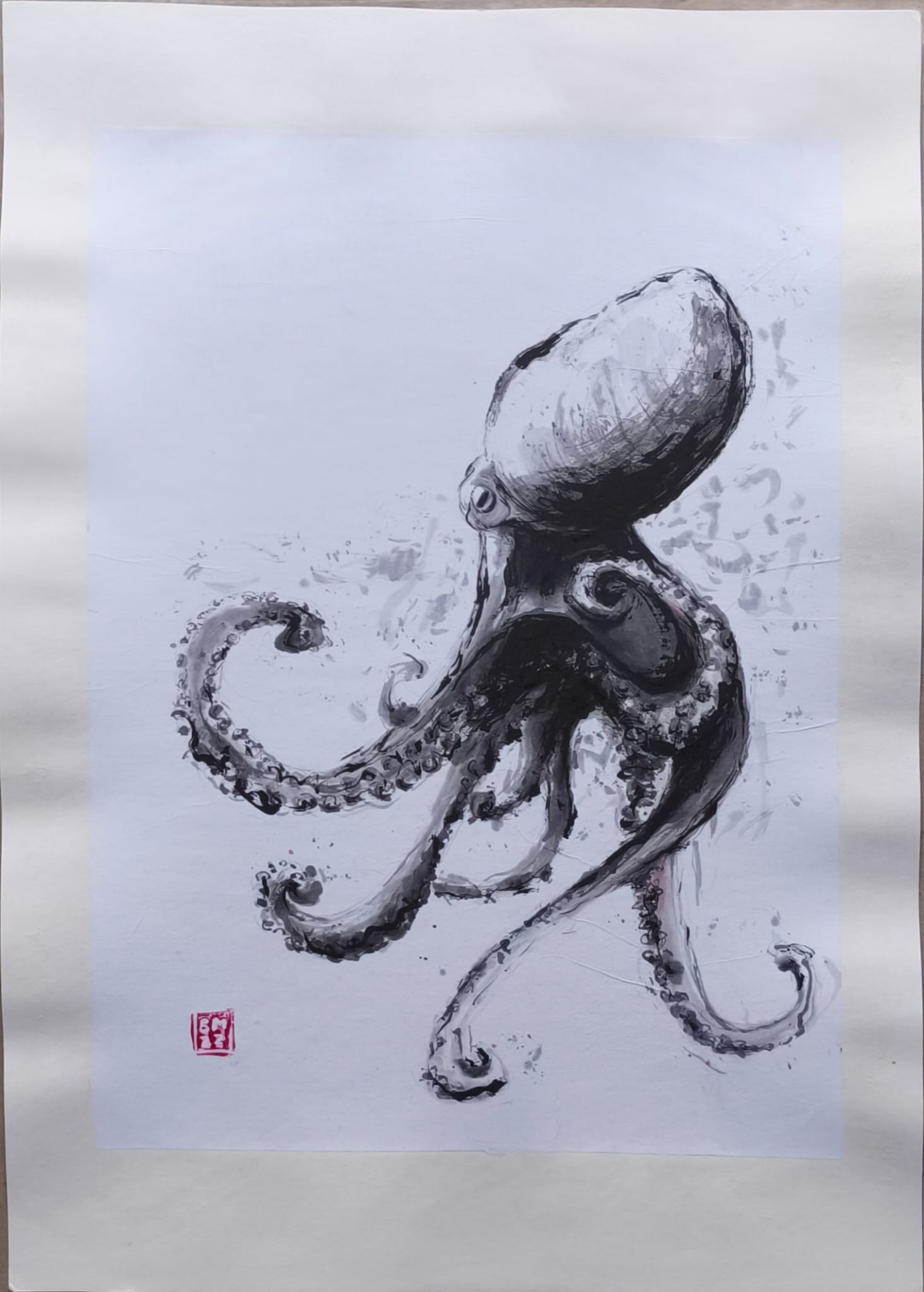 Ma démarche actuelle, approfondie aux ateliers de l’ESAL, se concentre sur l’art du Sumi-e. Je me consacre à la maîtrise de l’encre de Chine sur papier de riz, une discipline exigeante où je recherche l’essence du geste et l'équilibre du vide.