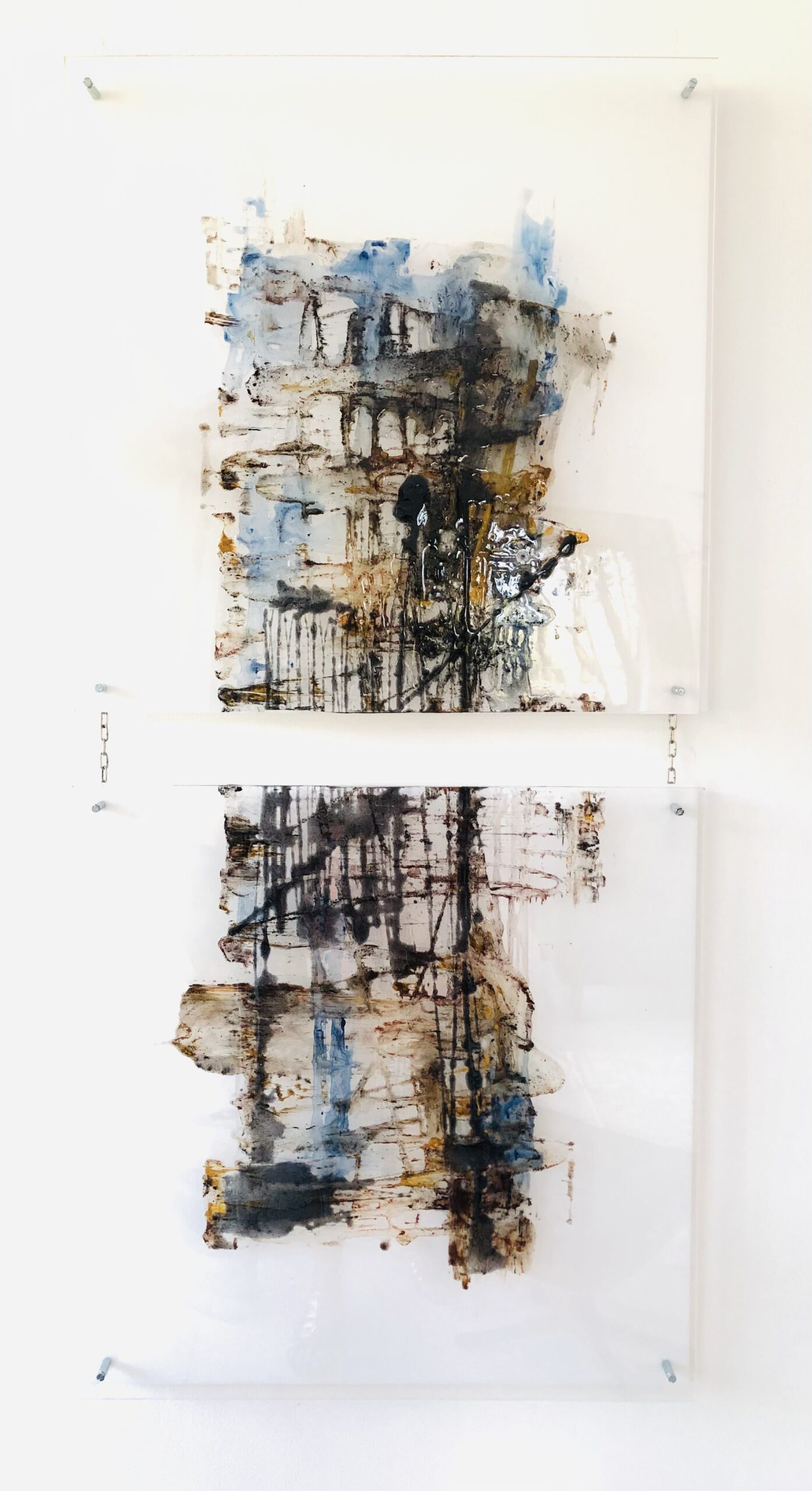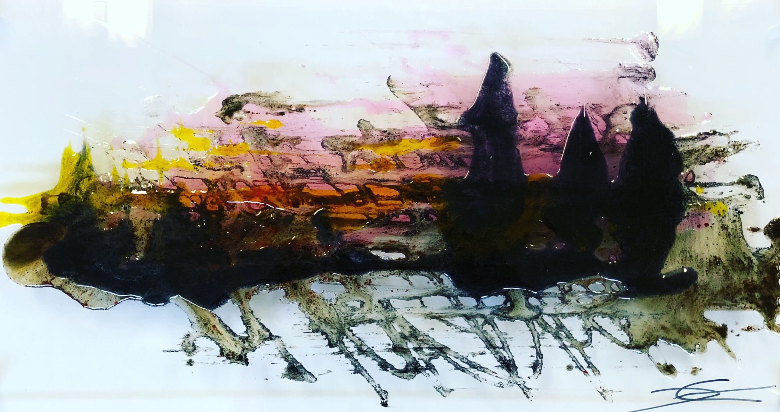 Laissant de côté la figuration longtemps représentée, je pousse les portes de l'abstraction. Grâce à la puissance des pigments, des encres et à la translucidité de la résines, mon travail sur les TRACES débuté après un séjour au Canyon des Ocres prend tout son sens.