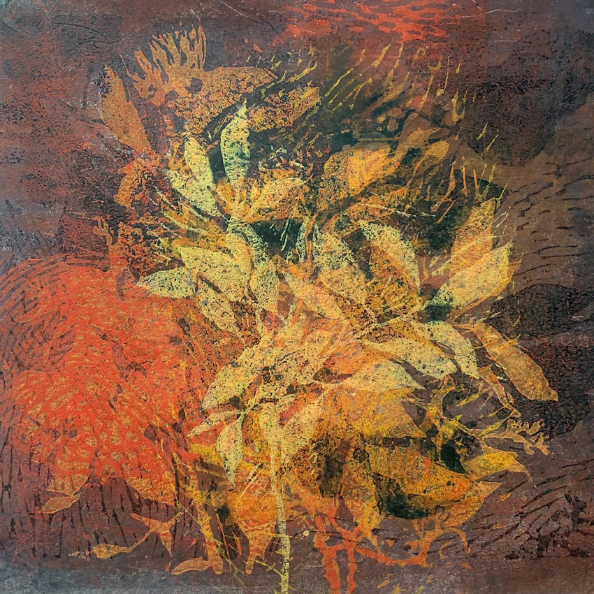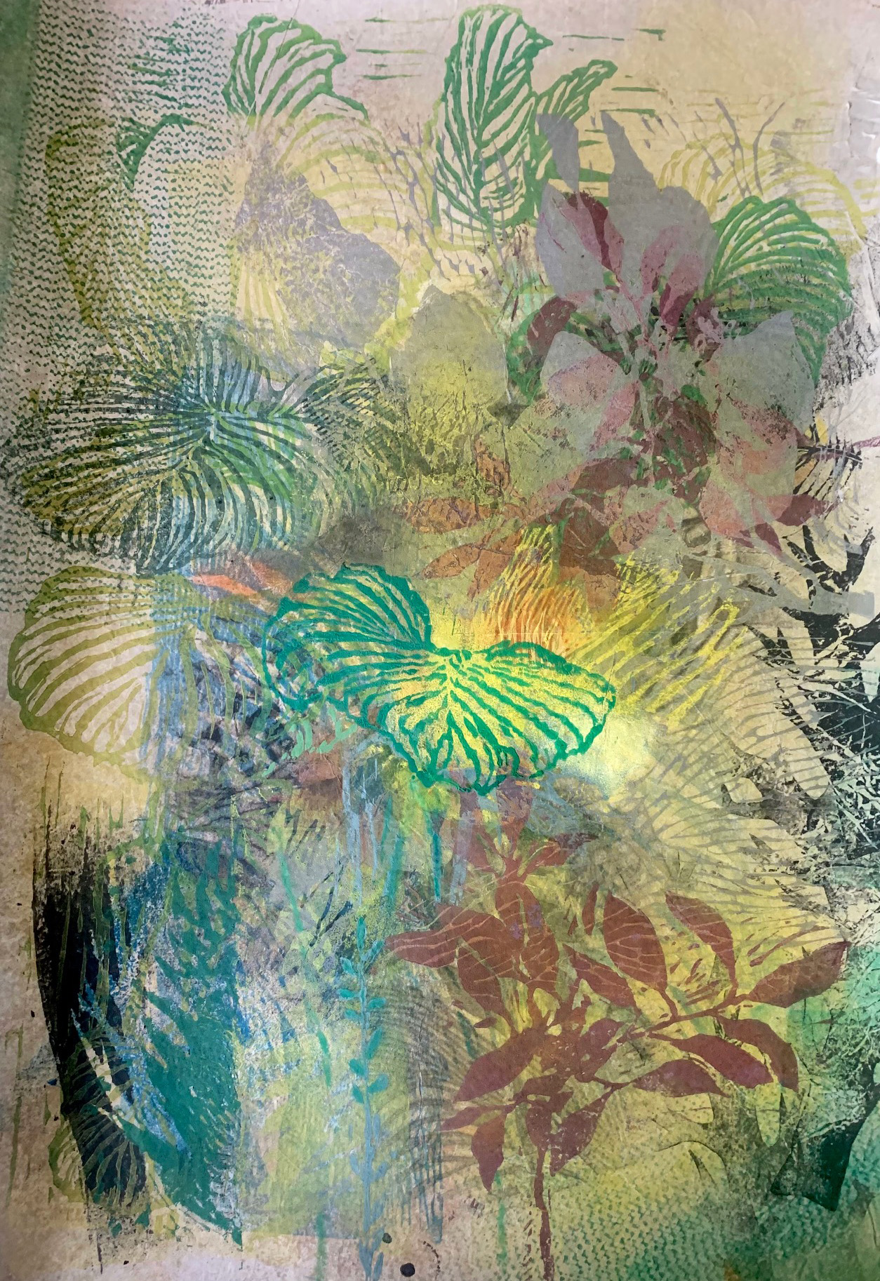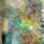En frontalité, sans contour ni modelé, les Calathéas, Cornouillers et autres Pavots cohabitent en strates vaguement translucides ou ajourées pour constituer une sorte de "Jungle"- merci M. le Douanier Rousseau- plus proche du millefeuille végétal que d'une évocation exotique. Le résultat est proche d'un tissu, d'un texte, d'un textile… toute une archéologie organique qui émerge, chargée d'accidents, de souvenirs, de racines et de déclinaisons.