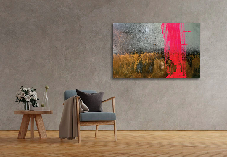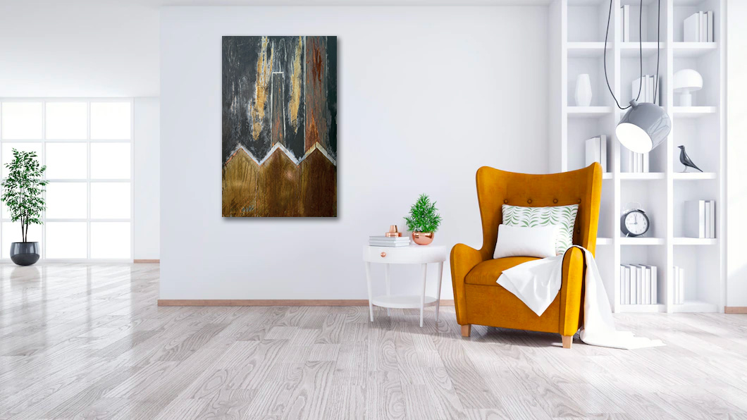 ou directement au pinceau. Ajout aussi de peinture et d’autres matériaux, finition verni laque mate.