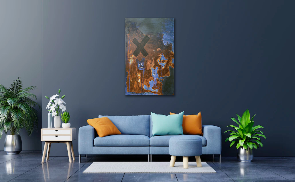 de rouille. La chimie opère soit par oxydation naturelle au gré de l’action aléatoire que je provoque à l’aide d’éléments tels que l’air, l’eau, la terre ou la végétation. Soit par l’action chimique de préparations que je concocte et que j’applique via des pochoirs