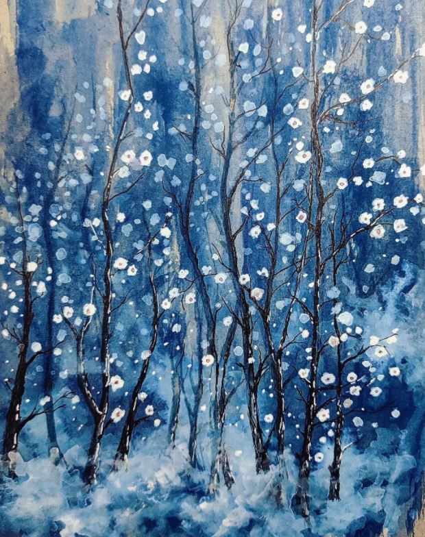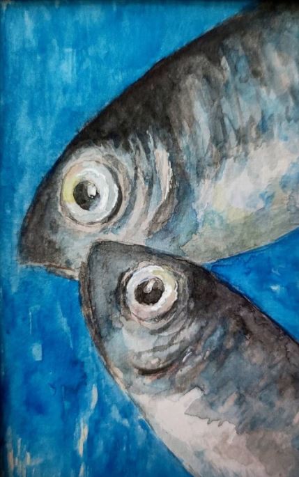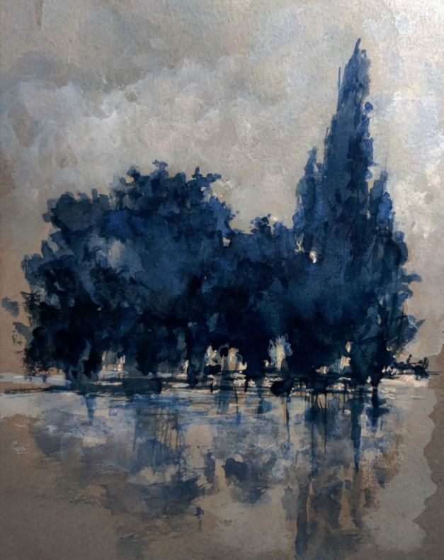 Ce sont les bleus qui souvent guident mon inspiration. Ils sont roi, de Prusse, Klein, d’outremer, gentiane, saphir, azur, marine…de quoi voyager un peu sur la palette terre. Mais les motifs, l’émotif sont pour moi ces arbres, ces monuments métaphysiques. Difficile d’en expliquer la raison, je pourrais le justifier d’un discours philosophique, spirituel ou conceptuel mais je me contenterai du simple sensoriel, de l’émotionnel : hauts, imposants, jeunes, vieux, fleuris, nus, ils racontent à celui qui veut bien entendre, l e vent caressant les feuillages, les bruits de la nature. Il est source d’inspiration, le monde est dans les arbres mais les miens ont souvent la particularité d’être bleus. Et de l’azur, il m’arrive de plonger dans la grande bleue et d’y trouver des poissons dont je tire une galerie de portraits…. Sardinoscopie, arbroscopie, floroscopie mon travail est un examen à l’imagerie médicale infidèle.