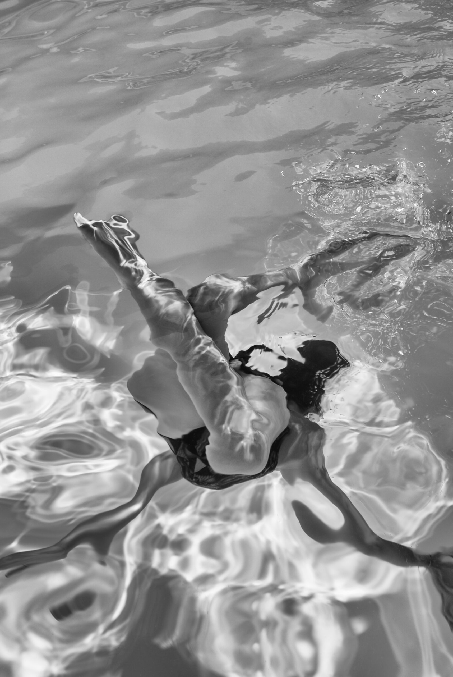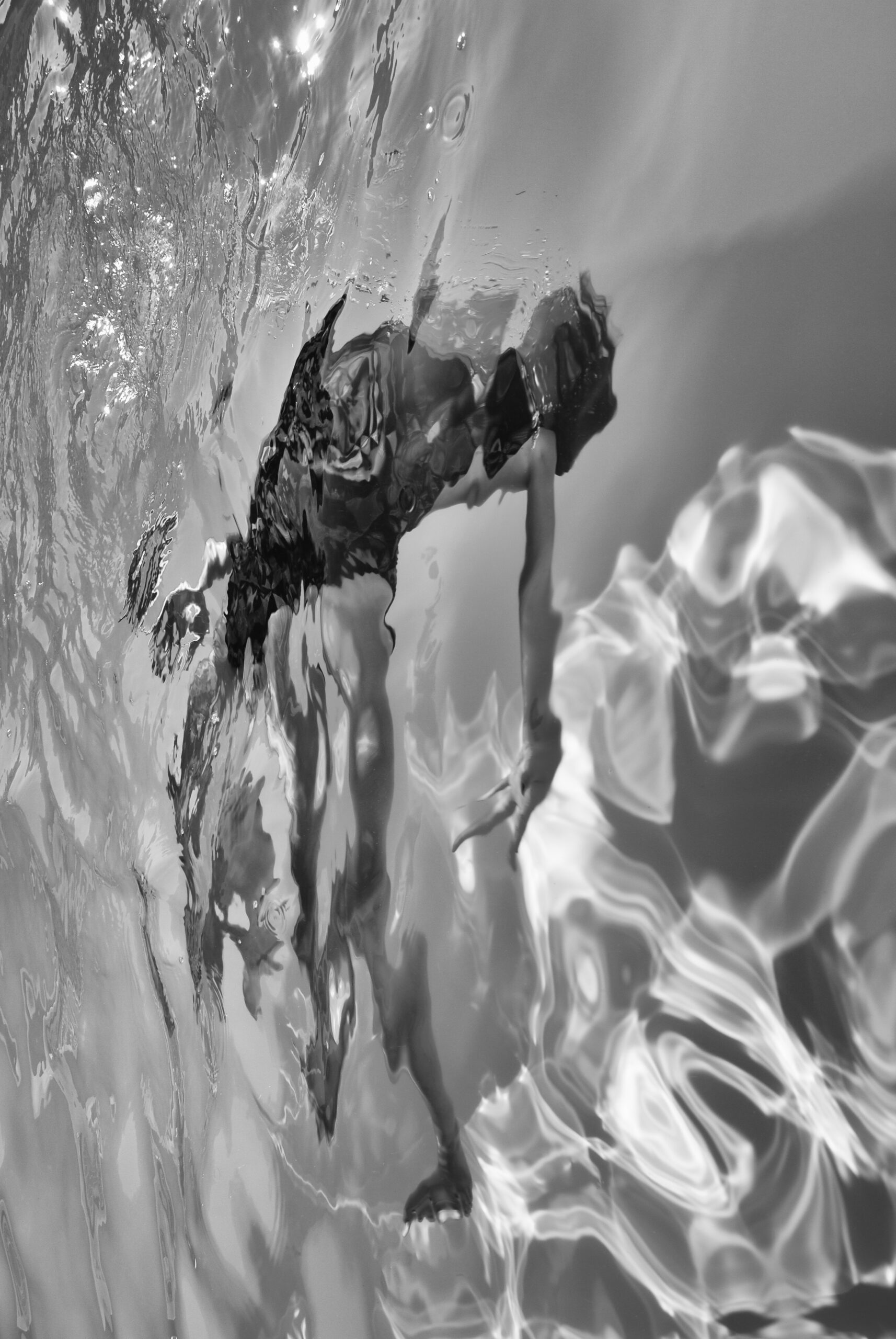 Et celle qui filme, « d’on n’sait z’où », attrape les étapes avant l’ère libre, en fait des pochoirs selon la profondeur… de l’eau… de la nageuse, de la distance avec l’obturateur… elle les relie. Nos yeux qui les regardent n’ont plus qu’à dupliquer les souvenirs impossibles de notre chrono-logis auxquels d’un coup on croit. On retrouve alors l’endroit commun de l’indétermination de nos identités lorsque dans le milieu de l’eau nous barbotions tous, bercés par le noir immensément éclairé et colorisé de la Vie mouvementée, aquatique. Mouvement t’es, je suis, nous sommes, tous, depuis « on ne sait d’où » et par où nous sommes arrivés''.