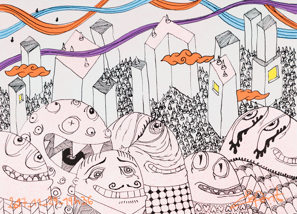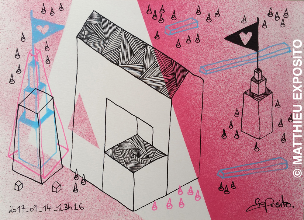 Matthieu Exposito observe les situations de vie en société. Il explore aussi bien le dessin, la performance, la sculpture et l'installation pour témoigner de son attention aux relations entre les hommes. Au travers d'une quête intime, il fait naître un univers où l'agitation humaine laisse place à la quiétude et à l'entente. Dans ses installations comme dans ses dessins aux couleurs vives, les lignes matérialisent le cheminement intérieur, une construction d'un monde commun et une possible histoire de paix entre les hommes. Celles-ci symbolisent ce qui unit et réunit les individus.