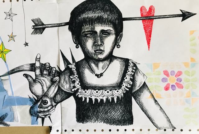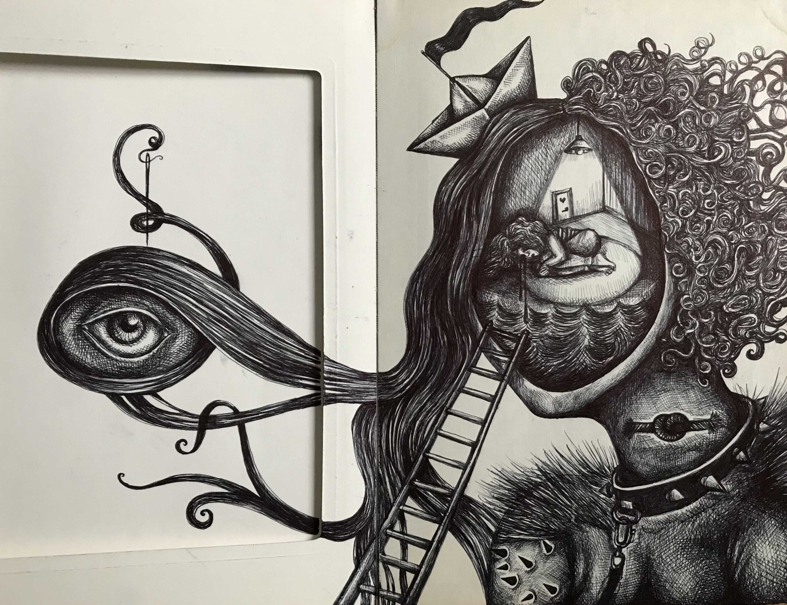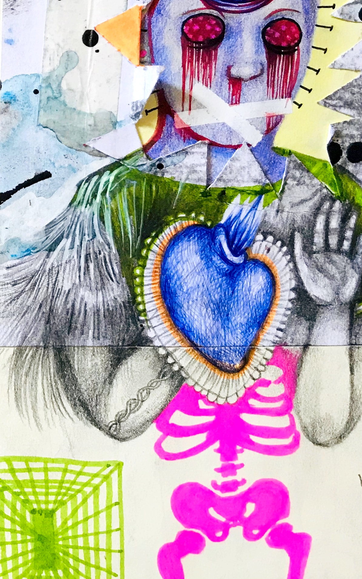 Le dessin a pour moi une double fonction: découper et coller, il est le scalpel et la suture. La ligne brise, coupe et déracine pour ensuite reconstruire des formes nouvelles. Le mélange et l'hybridation dans les références invoquées, dans les univers, les techniques, les outils et les supports m’intéressent beaucoup. Gravure, peinture expressionniste, Surréalisme, Rock'n'roll et culture populaire m'accompagnent également au quotidien.